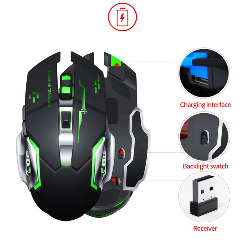 2.4G Wireless Silent Rechargeable 7 Colors LED Backlit USB 1600DPI Optical Adjustable Ergonomic Gam